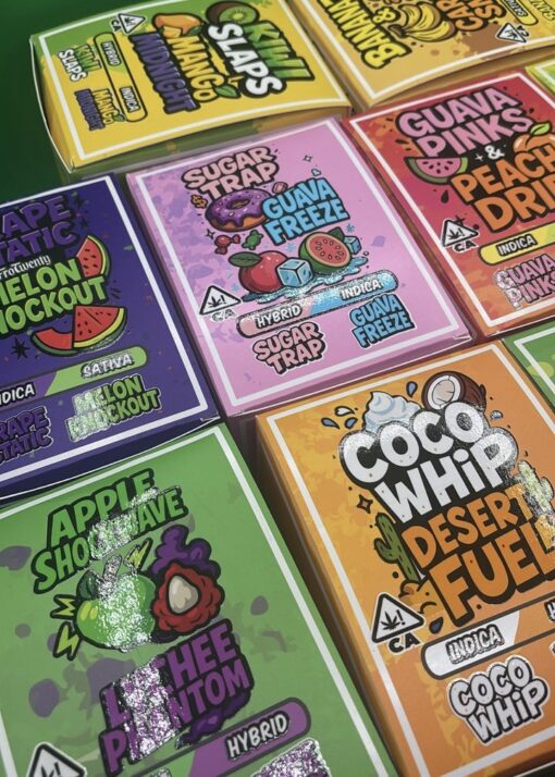 | Variation | KIWI SLAPS (HYBRID) X MANGO MIDNIGHT (INDICA), GRAPE STATIC (INDICA) X MELON KNOCKOUT (SATIVA), SUGAR TRAP (HYBRID) X GUAVA FREEZE (INDICA), APPLE SHOCKWAVE (SATIVA) X LYCHEE PHANTOM (HYBRID), COCO WHIP (INDICA) X DIESEL FUEL (HYBRID), GUAVA PINKS (INDICA) X PEACH DRIP (INDICA), PINA DRIP (HYBRID) X MELON SHOTZ (SATIVA), STRAWBERRY DRIP (SATIVA) X FROZEN PEACH HEAT (SATIVA), PINE POP HIT (INDICA) X SUNSET MANGO PUSH (INDICA), BANANAZ (SATIVA) X CARAMEL SMOKE (HYBRID), 10PK (MIXED FLAVORS), 25PK (MIXED FLAVORS), 50PK (MIXED FLAVORS), 100PK (MIXED FLAVORS) |